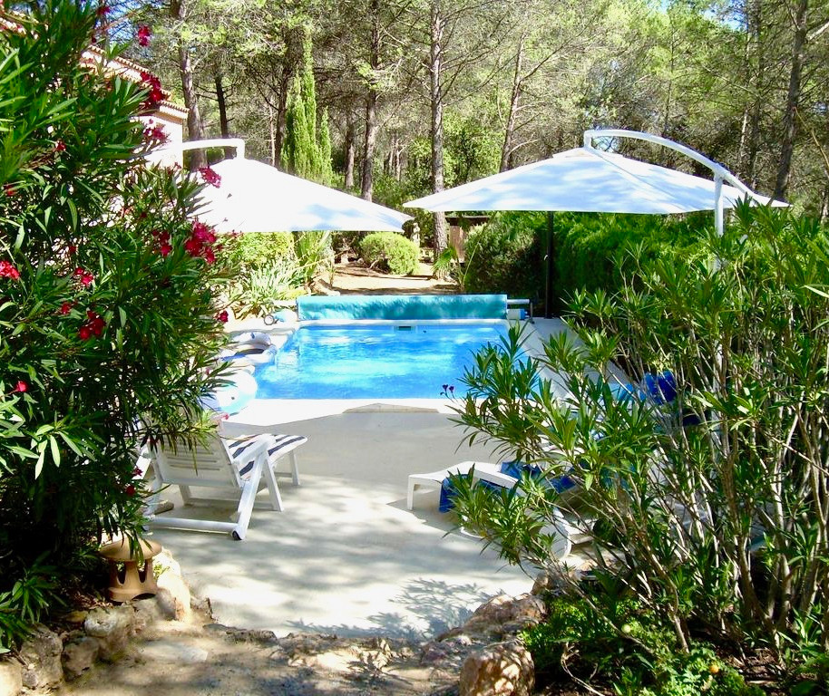 Je me suis posé sur 1500m2 de terrain entouré de haies et boisé d'oliviers...de pins...de lauriers...de thyms...je suis donc à l'abri des regards indiscrets et cela me permet de profiter tranquillement de ma piscine (7m50 x 4m) sécurisée et le plus ...CHAUFFÉE...
